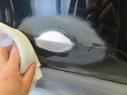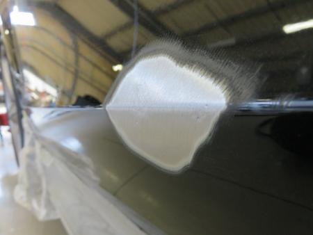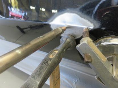 ダメージを受けた部分の塗装を削り、ピンポイントでスタッドを使い少しずつ元の高さまで引き出します。凹んでいる部分を引き出しながら、まわりをハンマーでならしていきます。 |