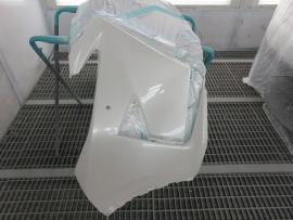 新品のフロントフェンダーに2液型のカラーサフェーサーを塗装します。 |