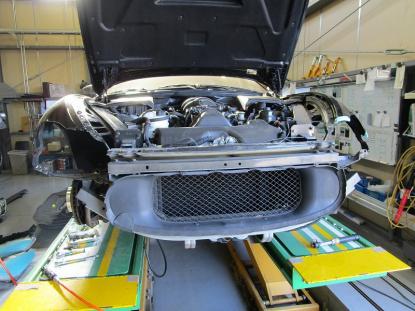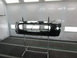 水研ぎで下地を仕上げてから塗装ブースの中で、フロントバンパーを専用の台にセットしたら塗装前の準備が完了です。 |