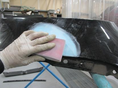 乾燥後、荒削りを行った後、バンパー専用のパテで表面を平滑に仕上げます。 |