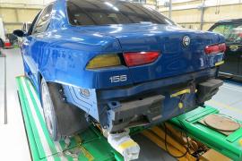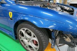 今回はめずらしく?赤(ロッソ)ではなく鮮やかなブルーパールのGTAの修理事例です。専用のエアロやマフラーといった外観からしてノーマルの156とは違い、とても迫力のある車両であり新車発売して時間が経っているにも関わらず根強い人気がある車両です。 |