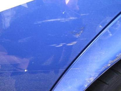 右フロントフェンダの損傷は、へこみはなくキズだけでしたのでダブルアクションサンダーで削り取り、脱脂後サフェーサーを吹き付けます。 |
