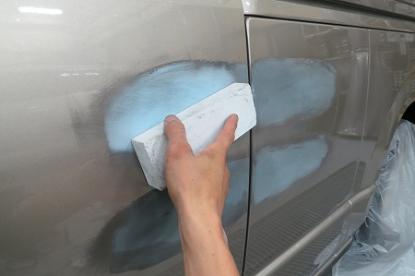 元の高さまで引き出したら鈑金が完了です。脱脂後、パテを薄く平らにつけます。 |