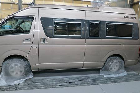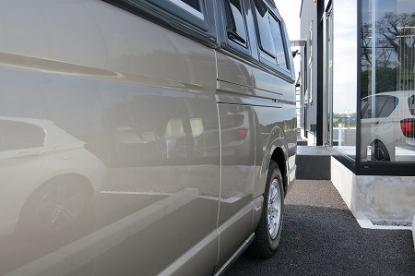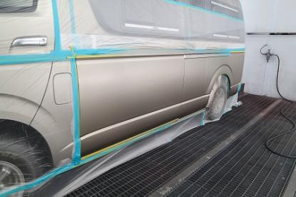 ゴミやほこりをシャットアウトされた塗装ブースの中でRM社の高級水性塗料を使い、その日の気温・湿度を考えてシンナーの選択をして、ハイエースオリジナルの塗装肌を再現していきます。 |