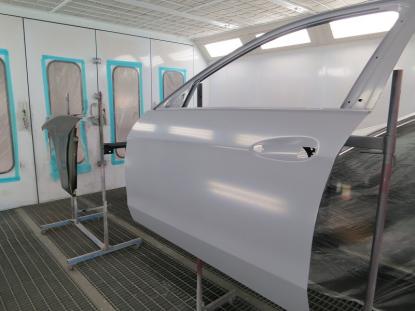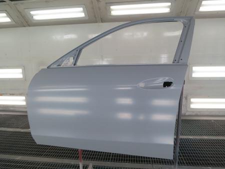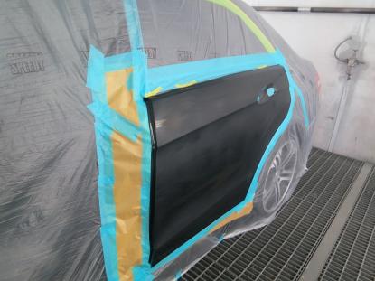 塗装作業です。新品のフロントドアに2液型サフェーサーを塗装します。 |