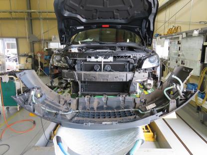 フロントバンパーからヘッドライトやフェンダーライナーを取り外していきます。 |