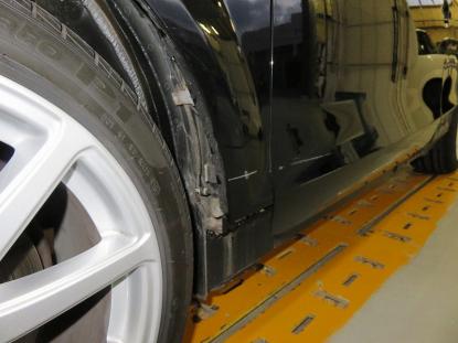 駐車場に停めていた間に、当て逃げ被害に遭われてしまい、加害者が見つからなかった為仕方なく自費で修理することになったお車の修理事例です。損傷箇所は左Frフェンダー・左Frドアと左Frホイールになります。 |