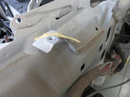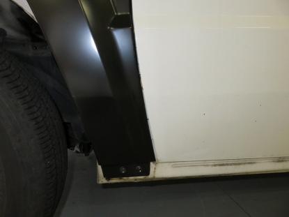 新品パーツをボディに取り付けします。新品とは言え必ず現車にあわせて、赤い矢印をしたところを中心に隙間や高さの調整をしていきます。 |