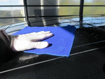 ボディ全体の汚れをシャンプー洗車した後、特殊なタオルで鉄粉を除去します。 |