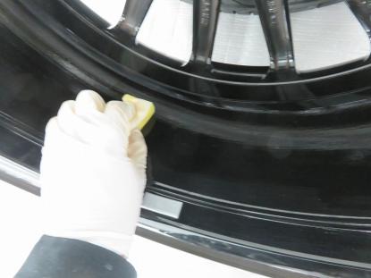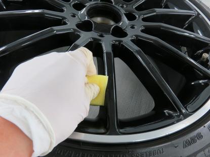 表面の傷を研磨し終えたら脱脂をしっかり行い専用のスポンジでコーティング剤を隅々まで塗っていきます。最後に専用のクロスで拭きあげたらホイールコーティングの完成です。 |