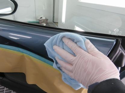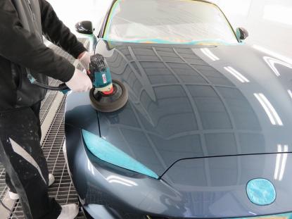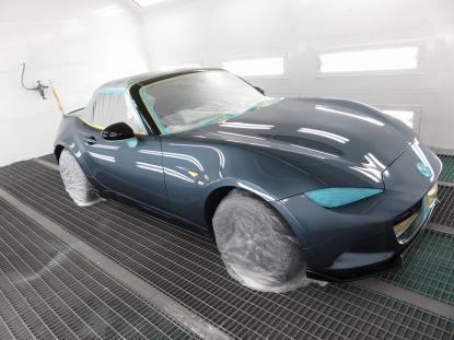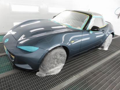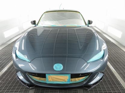 コーティング剤を塗った塗装の表面が白く濁った状態になるまで時間を置いてから、専用のクロスで拭き上げます。そして最後に、耐久性の高いコーティング被膜を形成させる為、塗装乾燥ブースにマツダロードスター(ND系)を入れ、60℃×1時間の加熱乾燥を行います。 |
