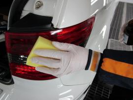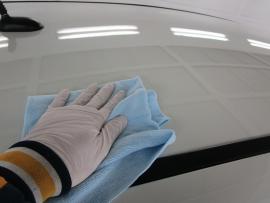 ボディ全体をシャンプー洗車して鉄粉等の汚れを除去してから、ボディのマスキング作業に取り掛かります。