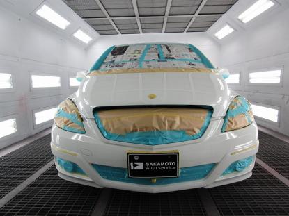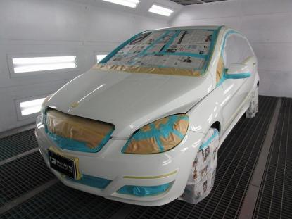 そして最後に、耐久性の高いコーティング被膜を形成させる為、塗装乾燥ブースにメルセデスベンツB170(W245型)を入れ、60℃×1時間の加熱乾燥を行います。