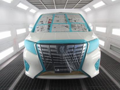 コーティング剤を塗った塗装の表面が白く濁った状態になるまで乾燥させてから、専用のクロスで拭き上げていきます。そして最後に、耐久性の高いコーティング被膜を形成させる為、塗装乾燥ブースにアルファードハイブリッド(30系)を入れ、60℃×1時間の加熱乾燥を行います。
