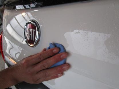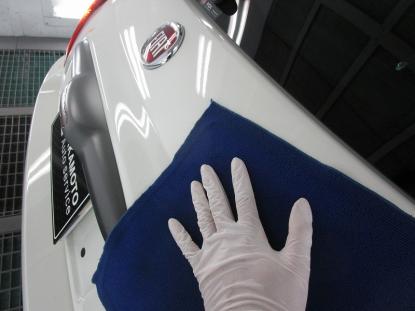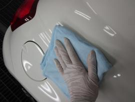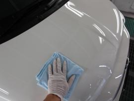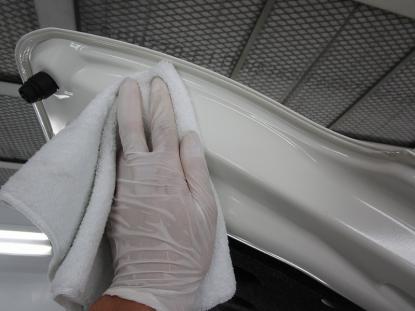 コーティング剤を塗った塗装の表面が白く濁った状態になるまで時間を置いてから、専用のクロスで拭き上げます。