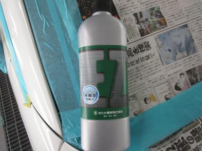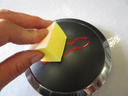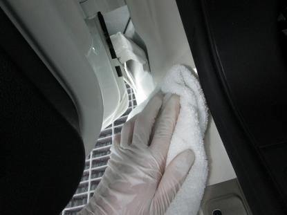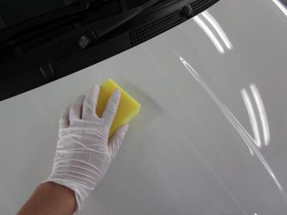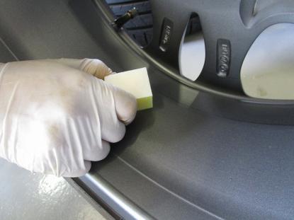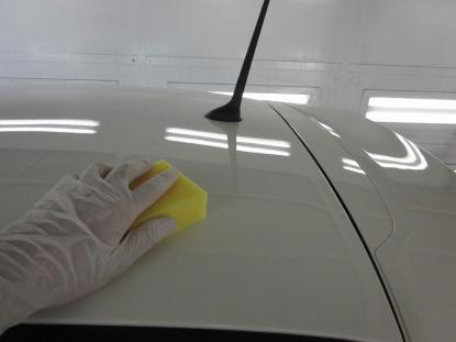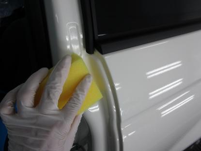 シリコンオフで脱脂後、専用のスポンジでコーティング剤を隅々まで塗っていきます。