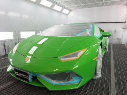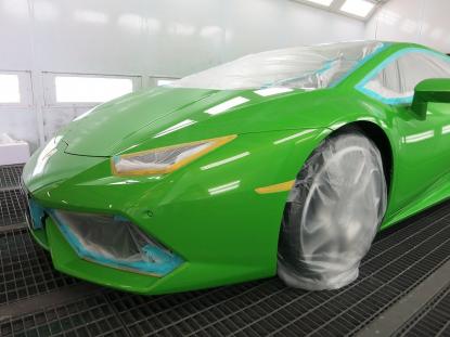 コーティグ剤を拭きあげた後、塗装乾燥ブースにランボルギーニ・ウラカンを入れ、60℃×1時間の加熱乾燥を行います。この熱処理により、コーティング被膜をしっかり硬化させることできます。これも毎度のことだと思いますが、塗装乾燥ブースを持つ鈑金塗装工場でボディコーティグを施工する最大のメリットであると思います。 |