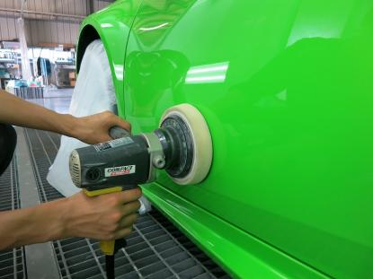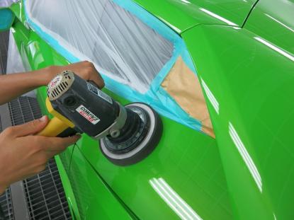 磨き作業の工程です。シングルポリッシャーにウールバフを付けて研磨、続いて粗いスポンジバフで研磨し、3工程目にやわらかいスポンジバフで研磨します。そして、最後にダブルアクションポリッシャーで仕上げます。合計4種類の磨き方で仕上げるのを基本作業とし、バフ目の出にくい施工方法で研磨しております。 |