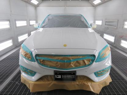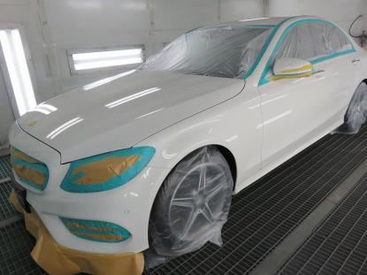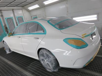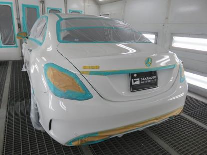 塗装乾燥ブースでメルセデスベンツC180(W205型)のボディコーティング剤に60℃×1時間の加熱乾燥を行います。