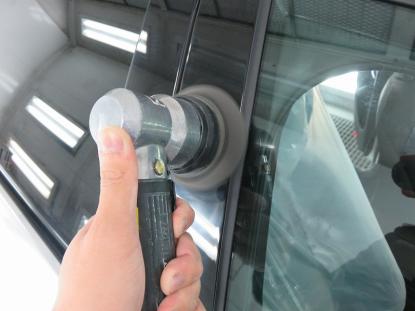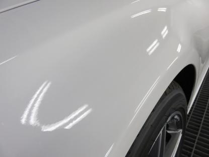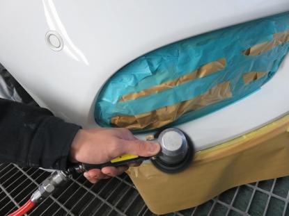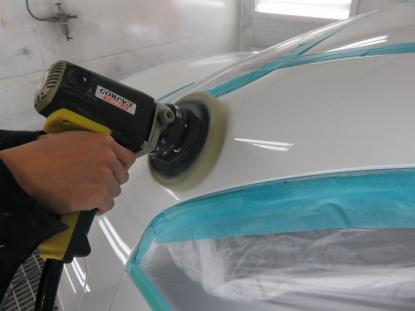 ボディを磨き始めました。坂本オートサービスでは、数種類の磨き方と数種類の材料を使い分けて仕上げるのを基本作業とし、バフ目やオーロラと呼ばれるギラギラの出ない施工方法で研磨しております。