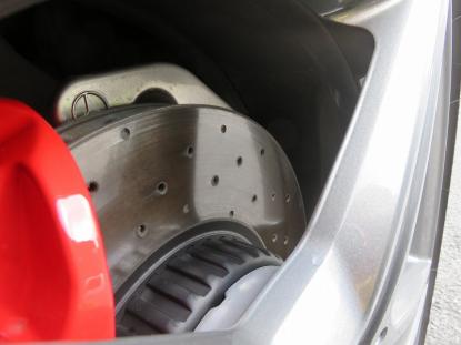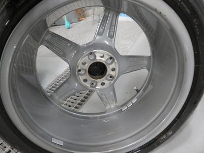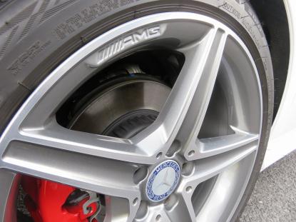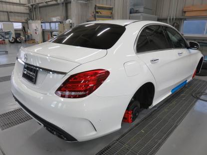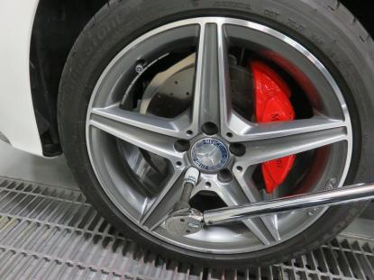 リフトにメルセデスベンツC180を乗せて四輪ともタイヤを取り外します。 |