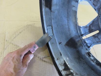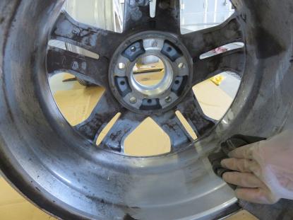ホイール裏側にこびり付いている汚れをシンナー等で掃除します。 |