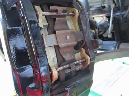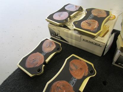 純正のブレーキパッドを取り外し、ディクセルのパッドを組み込んでいきます。 |
