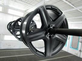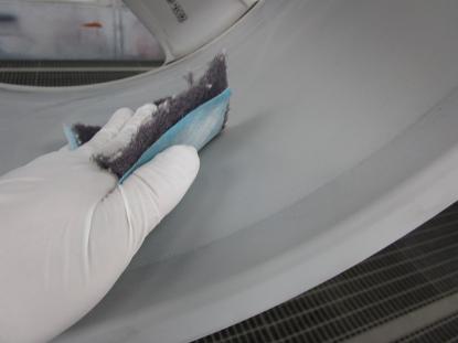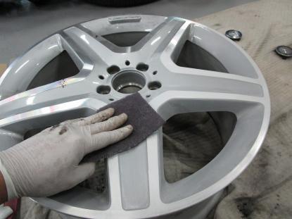 まず、ホイールからタイヤを取り外します。付着したブレーキダストや汚れを取りながら隅々まで足付けしていきます。 |