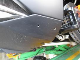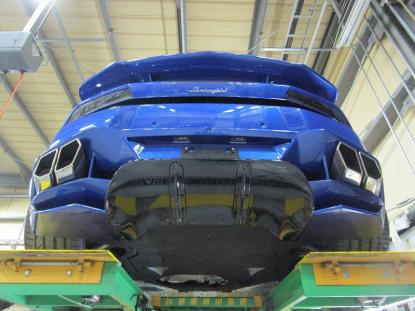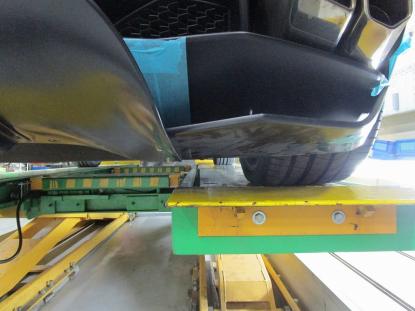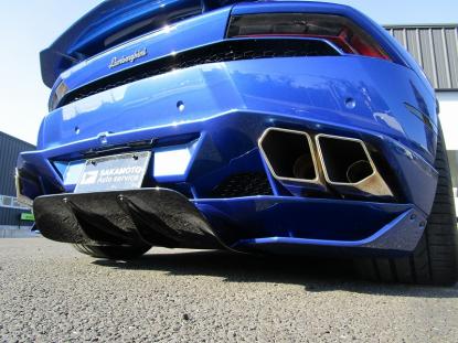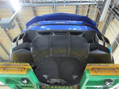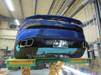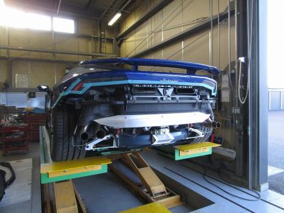 車両をリフトアップして、リヤディフューザーのフィッティングを行います。 |