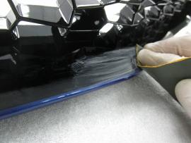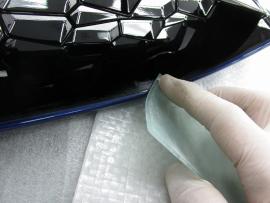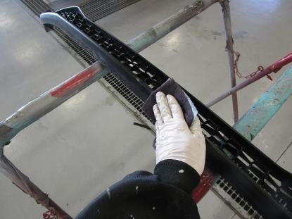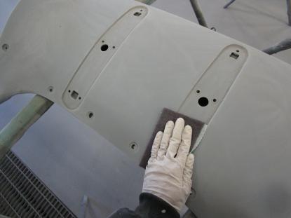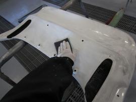 FRP製パーツの下地作業です。細かなピンホール等を確認しながら、表面をサンディングしていきます。 |
