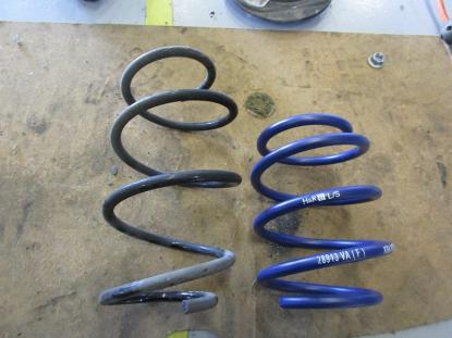 左側がノーマルサスで右側がH&Rのサスになります。大分短くなっているのが分かりますよね!新旧のサスを組み替えて取付けしていきます。 |