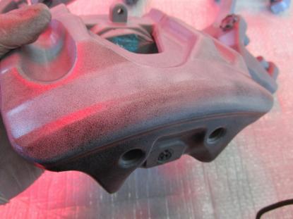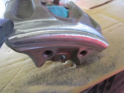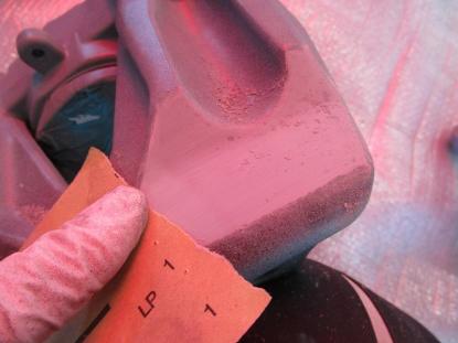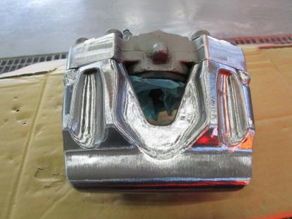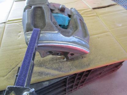 ブレーキキャリパー表面のザラザラをベルトサンダーで削り落としてきます。 |