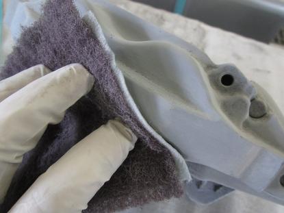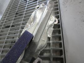 ブレーキキャリパー表面のザラザラをベルトサンダーで削り落としてきます。 |