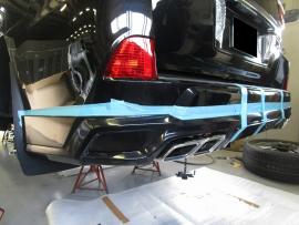 純正リヤバンパーのマフラー開口部などを加工しながら、ダブルエイトのアンダースポイラーを取り付けていきます。 |