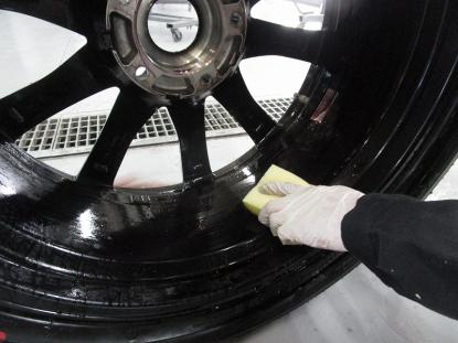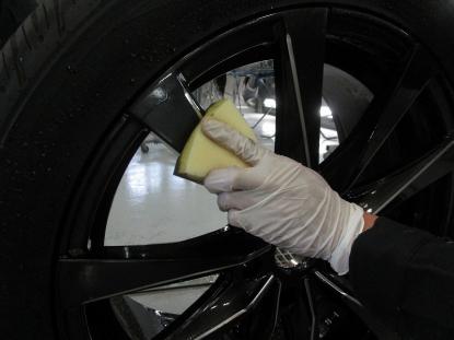 ホイールの水気を完全に取り除いてから、シリコンオフで十分に脱脂を行い専用のスポンジでコーティング剤を隅々まで塗っていきます。 |