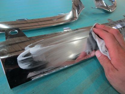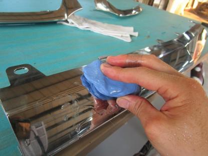 メッキパーツはラッピングフィルムを貼る前に、磨いて下地処理を行います。