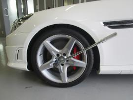 平坦なところでジャッキアップし、リジットラック(ウマ)で車両を固定します。 |