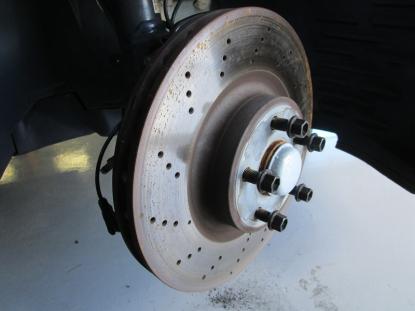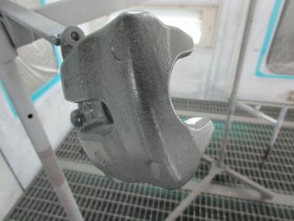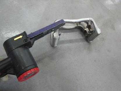 ブレーキキャリパー表面のザラザラをベルトサンダーで削り落としてきます。 |