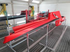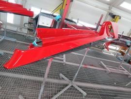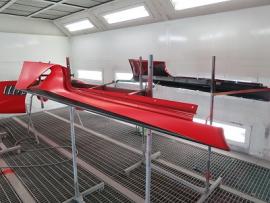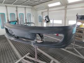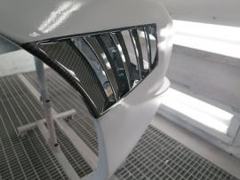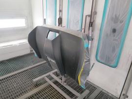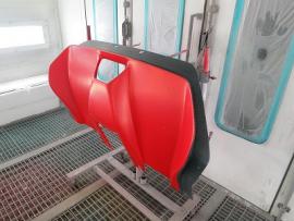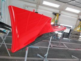 このようにサフェーサー塗装→水磨ぎ→クリアー塗装→水磨ぎ→マットブラック塗装→マスキング→赤塗装→マスキングを剥がし→クリアー塗装と何度も細かく工程をわけて作業いたします。ツートン塗装やとカーボン残し等の塗装はとても手間がかかります。 |