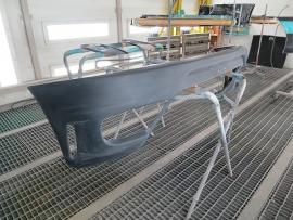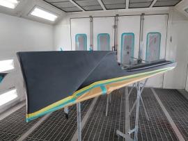 パーツの表面のデコボコをダブルアクションサンダーで削り落とし、小さなキズやFRP特有の巣穴と呼ばれる気泡のようなものをパテ等を使って丹念に1つ残らずなくす作業を行います。その後、サフェーサーを塗装し、さらに小さな巣穴を見逃さないためにきっちりガイドコートで確認しながら水磨ぎします。 |