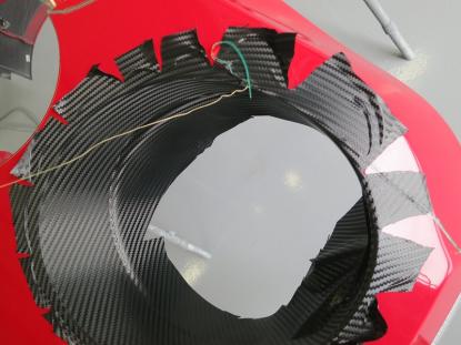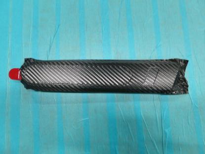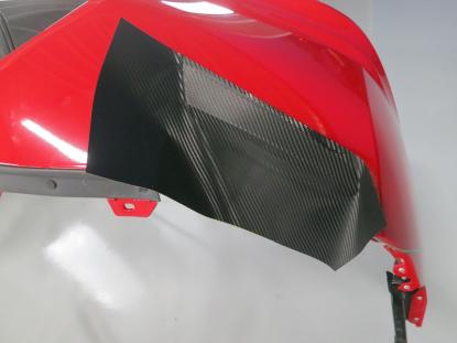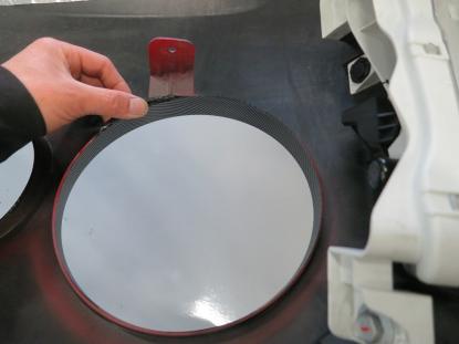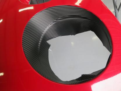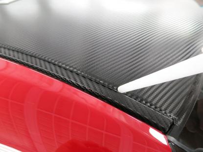 貼り付けたカーボン調フィルムをフェルト付きのヘラで空気を抜いて行きます。 |