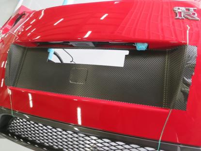リヤバンパーが取り外しされているので、このように裏側まで折り返してきっちり貼る事が出来ます。こう言った施工が可能なのは、脱着作業が容易に出来る板金塗装工場であるからであり、ラッピング施工する際の最大の強みでもあります。 |