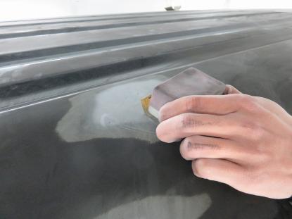 ルーフ全体にダブルアクションサンダーを使い、不具合のある場所を中心に削り取っていきます。 |