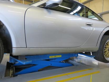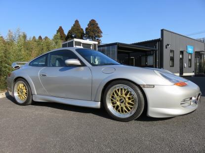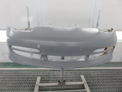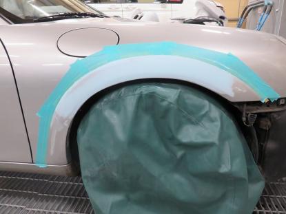 サイマ社のイタリア製高級塗装ブースの中でポルシェ911(996型)のマスキングが終わり、シリコンオフで脱脂をしたら塗装前の準備が完了です。 |