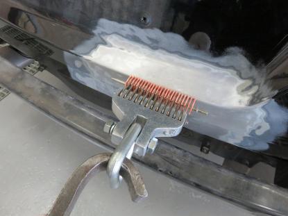 ダメージを受けた部分の塗装を削り、スタッドと呼ばれる溶接機を使いワッシャーの溶接をします。少しずつ元の高さまで引き出したら板金完了です。 |