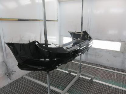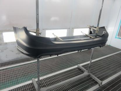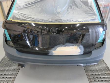 元の形に戻ったところで、新品のリヤバンパーを仮組みします。バックドアとの隙間や高さを確認してすべての板金作業が終了です。 |