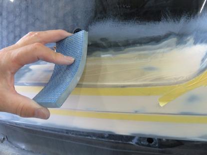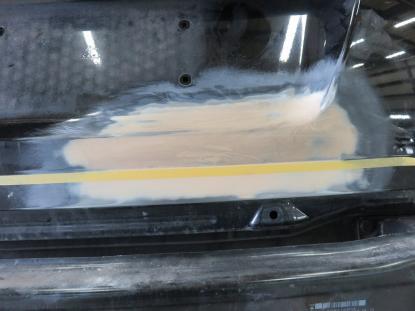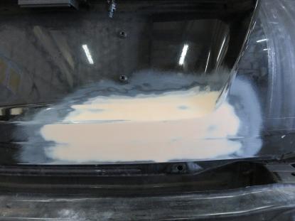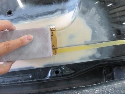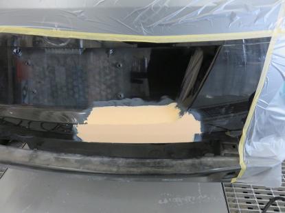 サフェーサーを吹き付ける前にガイドコート(黒い粉)をし、小さな穴や傷を見落とさないように最終確認します。 |