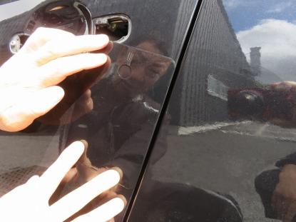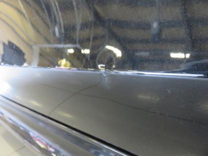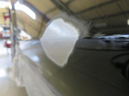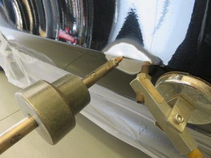 ダメージを受けた部分の塗装を削り、ピンポイントでスタッドを使い少しずつ元の高さまで引き出します。凹んでいる部分を引き出しながら、まわりをハンマーでならしていきます。 |