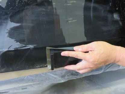 パテを平らになるよう削ります。プレスラインの部分はマスキングテープを使ってオリジナルを忠実に再現していきます。 |