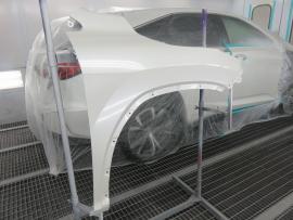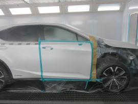 イタリア製の高級塗装ブースの中でレクサスRX450のマスキングをします。 |